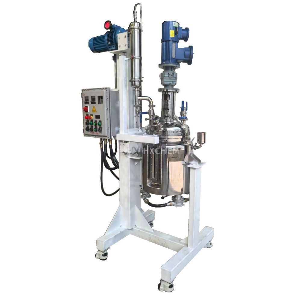 This kinds stainless steel reactor equipped with one end mechanical seal, pressure maximum up to 3bar, temperatrue up to 200C, the wet material fabricate in SS316L. The impeller adopt high viscosity spiral belt type, which is used for polymerization, Esterification polycondensation,resin plant, etc. This series stainless steel chemical reactor is widely used in laboratory or pilot plant reactors. The control cabinet fabricate in explosion proof, for operate safety works. The external condenser will helps vapors condensate ruflux to reactor. Electric Chain lifting devices for lid lifting and lowering for labor cost saved.
